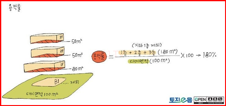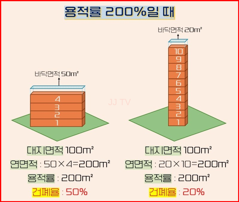 용적률은 건물의 연면적을 대지면적으로 나눈 비율로 계산됩니다. 건폐율은 건물의 건축면적(바닥 면적)을 대지면적으로 나눈 비율로 계산됩니다.
