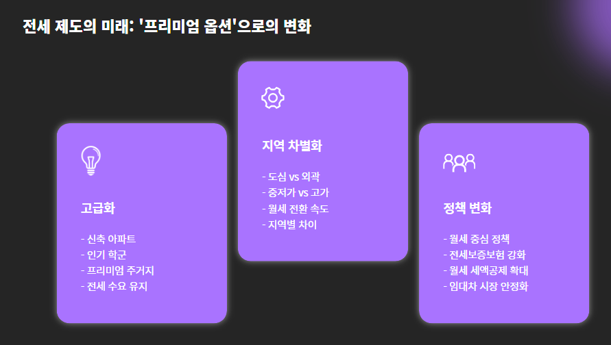 신축 고급 아파트나 인기 학군 지역 등 일부 수요가 있는 곳에서는 전세가 유지되지만, 중저가 단지나 외곽 지역에서는 월세 전환이 계속될 전망입니다.