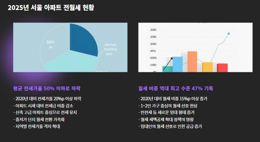 2025년 상반기 기준 서울 아파트의 평균 전세가율은 50% 이하로 하락했고, 월세 비중은 역대 최고 수준인 47%를 기록했습니다.