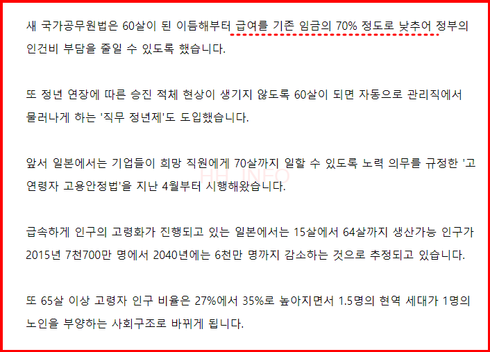 정년이 연장되면 기업들은 인건비 부담이 커질 수밖에 없습니다. 대한민국의 호봉제도 특성상, 나이가 많아질수록 임금이 상승하기 때문에 기업의 부담이 가중될 수 있습니다. 일본은 이러한 문제를 해결하기 위해 공무원법에 따라 60세가 되면 기존 임금의 70% 정도로 낮추고, 관리직에서 물러나는 직무 정년제를 도입했습니다.