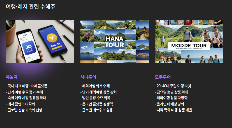 | 하나투어 | 해외여행 회복 + 단기 여행 수요 증가 |
