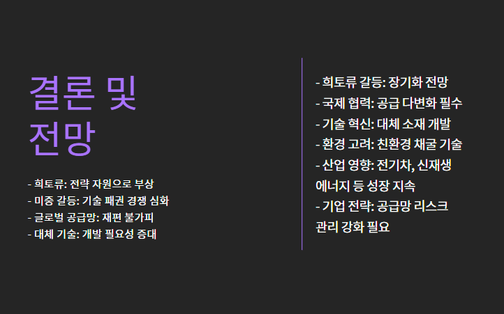 - 기업과 정부 모두 희토류 공급망의 다변화 및 대체 기술 확보가 필수.