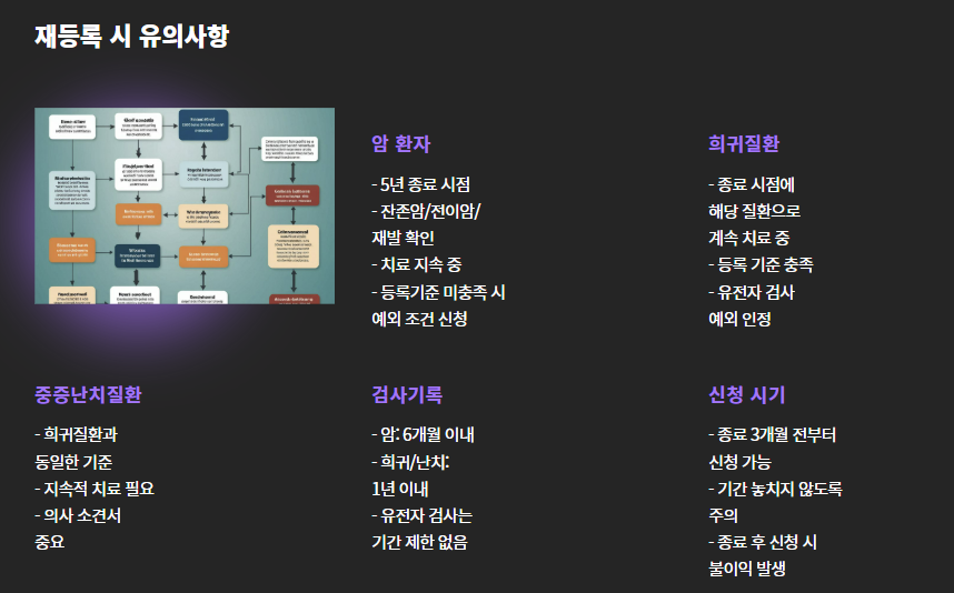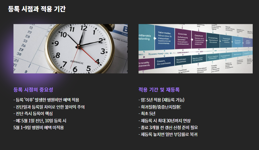 - 희귀질환/중증난치질환: 최초 5년 이후 재등록을 통해 최대 30년까지 연장 가능
