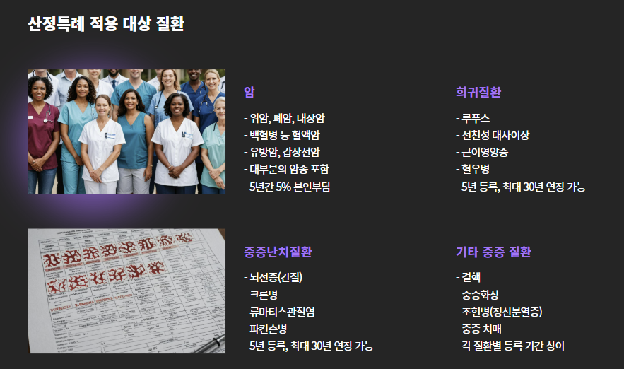 - 기타 중증 질환 (결핵, 중증화상, 조현병, 중증치매 등 일부 포함)