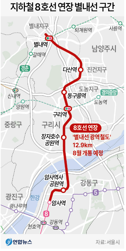 지하철 8호선 별내선 연장 개통 노선도 구리 암사 남양주 다산