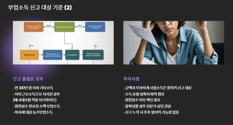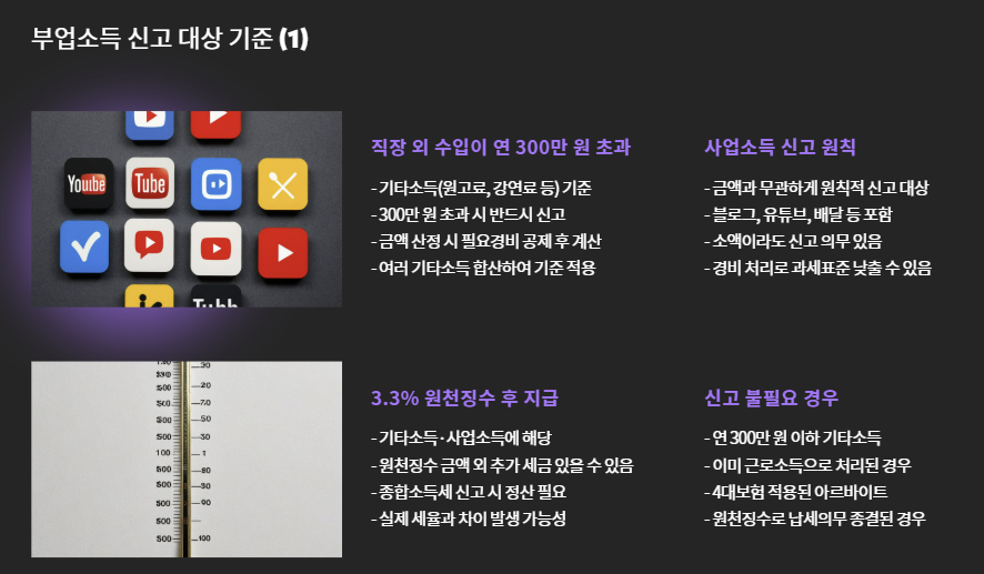 - **사업소득(배달, 블로그, 유튜브 등)**은 금액과 상관없이 원칙상 신고 대상입니다.