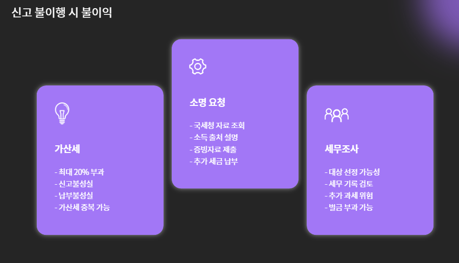 - 가산세 부과: 신고 불이행 시 최대 20%의 가산세