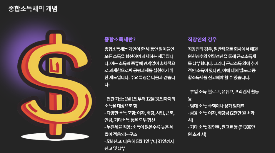 종합소득세는 쉽게 말해, 한 해 동안 내가 벌어들인 ‘모든 소득’을 합산해서 내는 세금이에요.