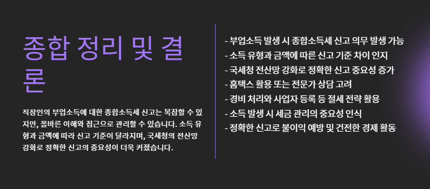 - 신고 기준은 소득 유형과 금액에 따라 달라지며, 소액이라도 신고 대상이 되는 경우가 많습니다.