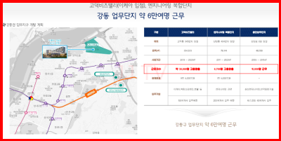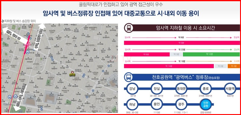 강동구는 고덕비즈밸리와 같은 업무단지를 포함하여 6만 개의 일자리를 제공하고 있으며, 교통 환경 또한 우수합니다. 대중교통을 통해 서울의 핵심지인 잠실역과 강남역 등에 빠르게 접근할 수 있으며, 향후 서울세종고속도로의 개통 예정으로 더욱 편리한 교통망을 기대할 수 있습니다.