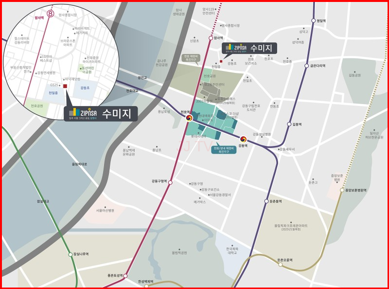 천호동 모아타운 5구역의 '수미지'는 암사역, 천일중, 강동초, 천호공원 등 주요 시설과 인접하며, 43.35m²(3룸1화)과 54.69m²(3룸2화)의 신축 아파트 매물을 제공합니다.