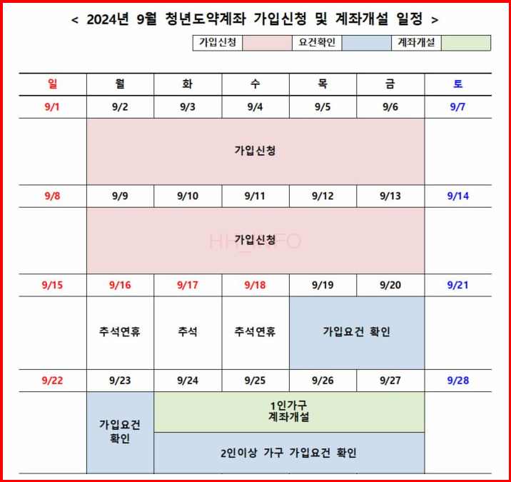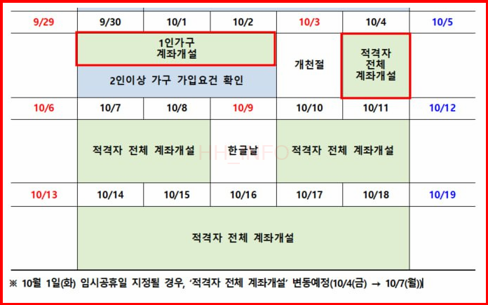 9월 신청 기간은 첫째 주와 둘째 주로 진행되며, 이후 추석 연휴가 지나고 가입 요건을 확인한 후 계좌 개설이 시작됩니다. 1인 가구는 10월 2일까지 계좌를 개설해야 하며, 이후 10월 4일부터는 적격자 전체의 계좌 개설이 가능합니다. 만약 국군의 날(10월 1일)이 임시공휴일로 지정되면, 전체 계좌 개설이 10월 7일부터 시작됩니다.
