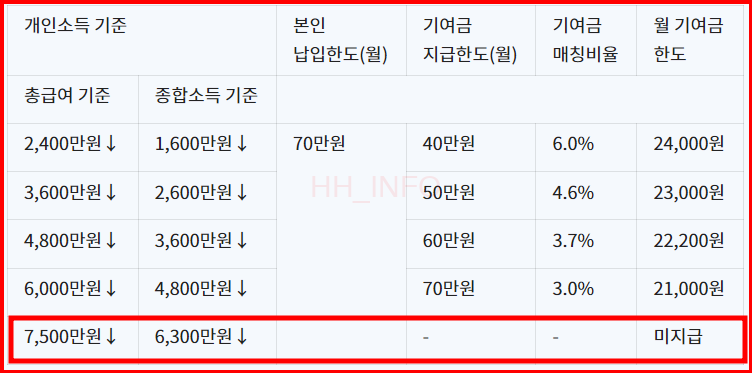 - 유지심사: 매년 가입일이 속한 월에 개인 소득을 점검하여 기여금 지급 여부 결정