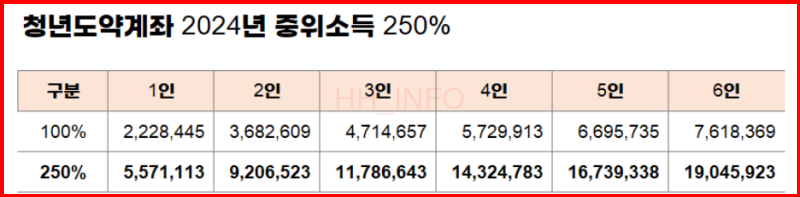 중위소득이란 대한민국 모든 가구의 소득을 순서대로 나열했을 때 중간에 해당하는 소득을 말합니다. 중위소득 250% 기준은 가구원 수에 따라 다르며, 24년 기준 2인 가구의 경우 920만원, 1인 가구는 557만원입니다. 가구원은 주민등록등본에 등재된 인원으로 결정됩니다.