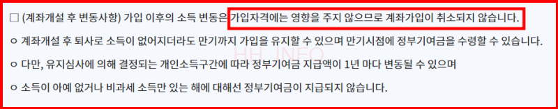 - 소득 초과 시: 7,500만원 초과 시 계좌 가입은 유지되지만, 기여금은 지급되지 않으며 비과세 혜택은 그대로 적용