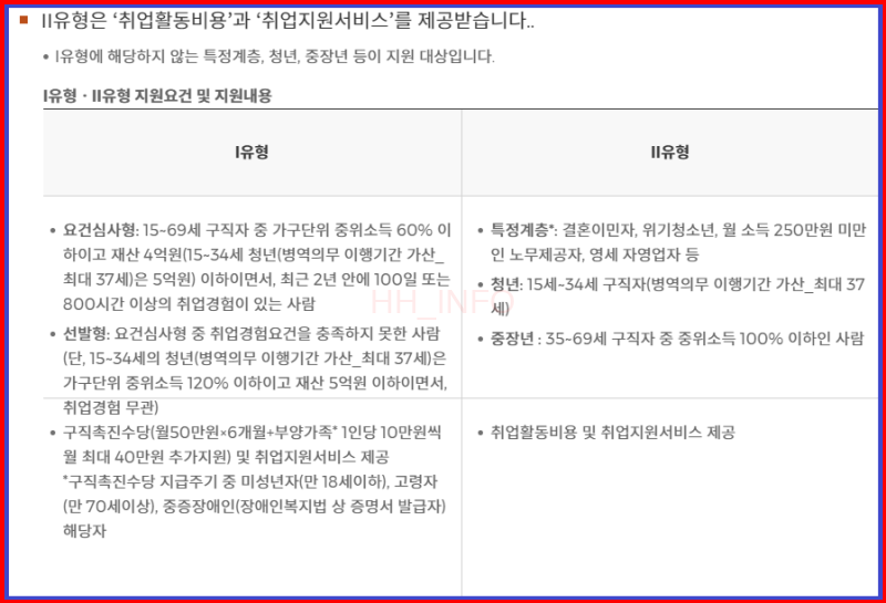 [유형 별로 달라지는 지원 조건] 유형 1과 유형 2가 있어. 유형 1은 최대 300만 원 받을 수 있는 거고, 유형 2는 다른 혜택을 받을 수 있어. 조건이 조금씩 달라서 자세히 살펴봐야 한다. 결론적으로는 유형 1이 더 많은 혜택을 누릴 수 있지만 유형 2의 취업활동 비용 및 취업지원 서비스도 좋은 혜택이기 때문에 대상이 된다면 신청하는 것이 좋다.