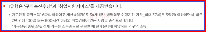 1유형은 가구단위 중위소득 60% 이하이고 재산 4억원(15~34세 청년은 5억원) 이하이면서, 최근 2년 안에 100일 또는 800시간 이상의 취업경험이 있는 경우 해당된다.