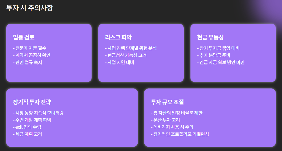 - 관리처분 이후는 안전하지만 수익률 제한적