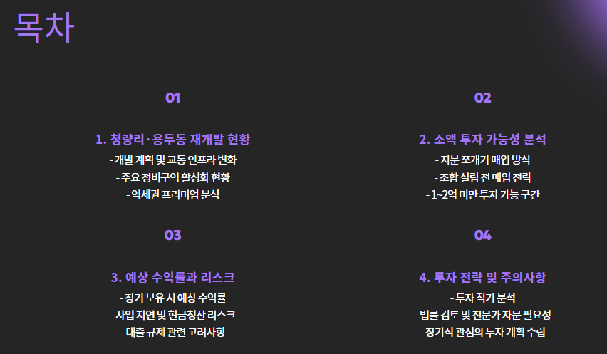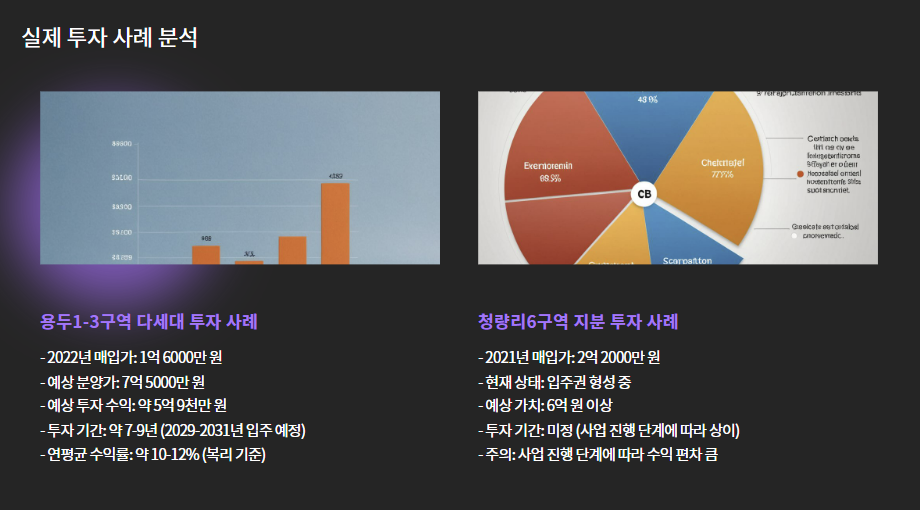 | 청량리6구역 지분 | 2021년 | 2억 2000만 원 | 입주권 형성 중 | 약 6억+ 가치 기대 |