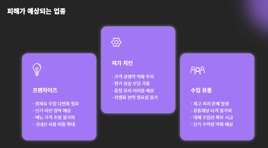 - 치킨 프랜차이즈 업계: 원재료 수입 다변화 필요성 증가, 단기 마진 압박