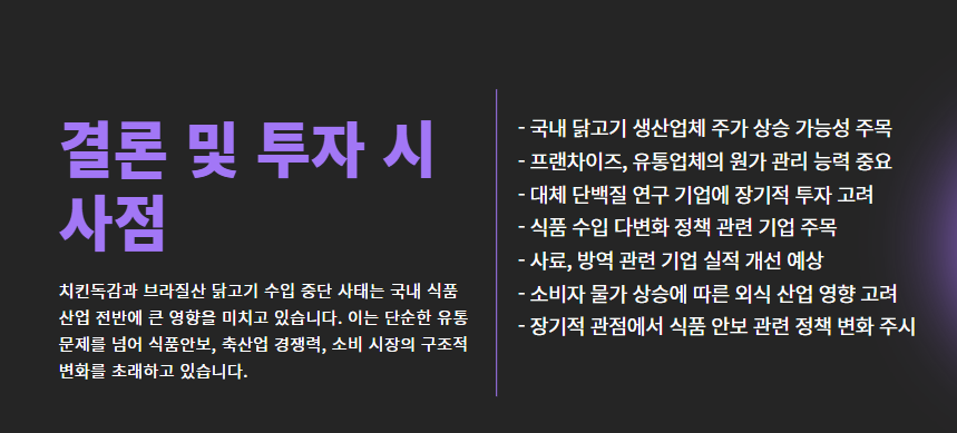 치킨독감과 브라질산 수입 중단 이슈는 단순히 유통의 문제가 아니라 식품안보, 축산산업 경쟁력, 소비시장 전반의 구조적인 도전과 기회를 함께 던져주고 있습니다. 투자자라면 관련 수혜주에 대한 냉철한 분석과 함께, 외식업 및 식품 가공 산업 전반에 미칠 영향을 종합적으로 고려해야 할 때입니다.