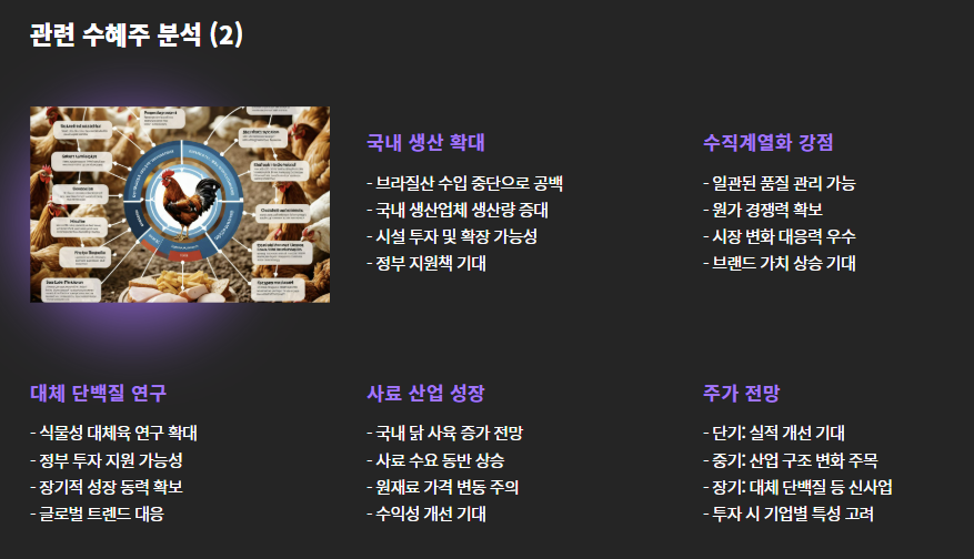 치킨독감 이슈와 브라질산 수입 중단으로 수혜가 예상되는 종목들을 살펴보면 다음과 같습니다.