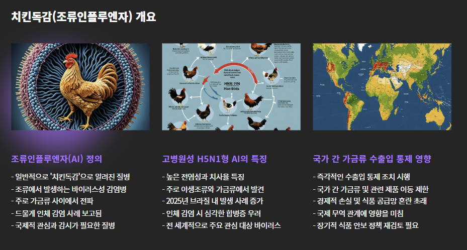 ‘치킨독감’은 흔히 **조류인플루엔자(AI, Avian Influenza)**를 일컫는 말입니다. 특히 이번에 확산되고 있는 고병원성 H5N1형 AI는 전염성과 치사율이 높아, 국가 간 가금류 수출입 통제가 즉각 이뤄지는 사안입니다.