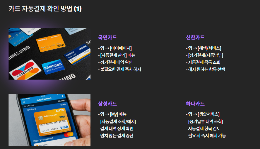 - 국민카드: 앱 → [마이페이지] → [자동결제 관리]