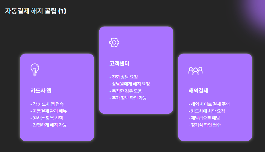 - 각 카드사 고객센터 또는 앱에서 정기결제 해지 가능