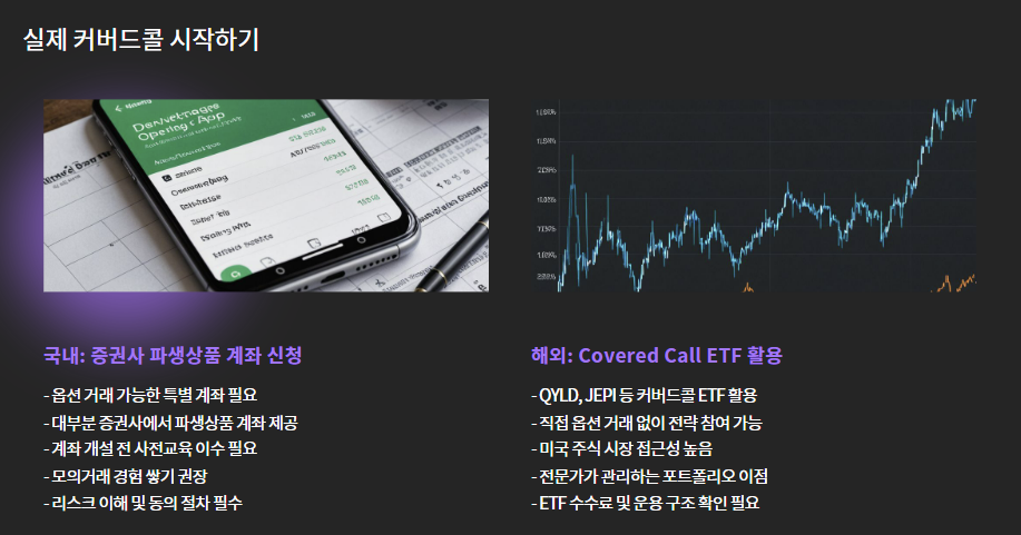 커버드콜은 직접 옵션을 매도해야 하므로, 일반적인 주식 계좌론 어렵고,