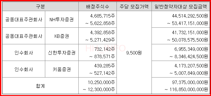 - 주관사: NH투자증권, KB증권, 신한투자증권, 키움증권