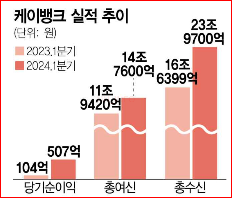 케이뱅크는 2024년 1분기 기준으로 사상 최대 분기 실적인 당기순이익 507억원을 달성했습니다. 이는 고객 수 1,000만명을 돌파한 성과와 더불어 케이뱅크의 안정적인 성장세를 보여줍니다. 또한 2021년 225억원, 2022년 836억원, 2023년 1,028억원의 순이익을 기록하며 꾸준히 성장하고 있습니다.