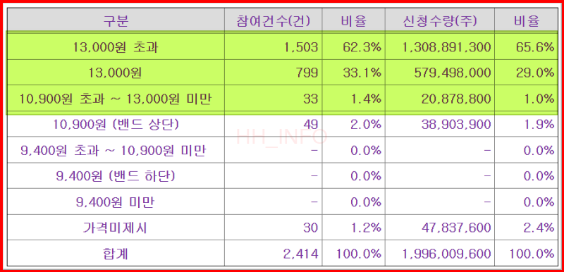 - 기관 투자자 참여율: 참여 기관 중 96%가 10,900원을 초과하는 금액을 제시했습니다. 총 2,414개 기관이 참여하여 높은 관심을 보였습니다.