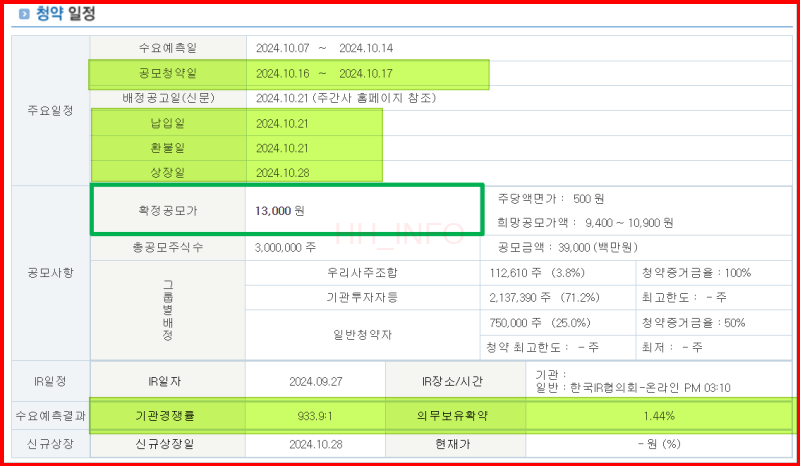 - 의무보유확약률: 의무보유 확약률이 **1.44%**로 낮은 수치를 보였는데, 이는 기관들이 상장 이후 주식을 오래 보유할 의사가 크지 않다는 것을 의미합니다.