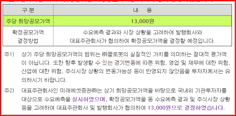 클로봇의 이번 수요예측 결과는 933.9 : 1로 올해 진행된 공모주 중 상위권에 해당하는 경쟁률을 기록했습니다. 공모가는 13,000원으로, 상단 가격인 10,900원에서 약 20% 초과된 금액으로 결정되었습니다. 이는 기대 이상으로 높게 책정된 공모가로, 투자자들에게 부담이 될 수 있는 부분입니다.