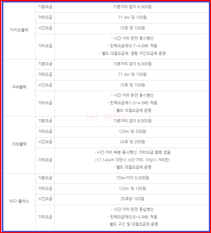 - 고급 택시의 경우, 카카오블랙, 우버블랙, 리모블랙, 타다 플러스 등이 있으며, 요금은 회사마다 차이가 있다.