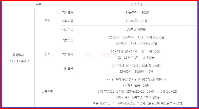 - 택시 기본요금 인상뿐만 아니라 심야할증 시간과 계산 방법까지 변경되었다.