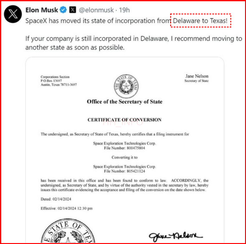 - 테슬라 법인 소재지 변경 (델라웨어 → 텍사스)