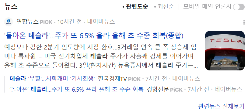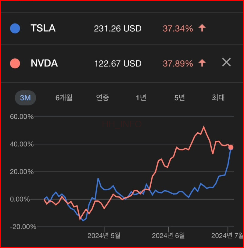 전기차에 대한 시장의 우려감을 일부 씻어내주는 시원한 급등이었죠. 엔비디아와 AI 관련주들이 주춤하는 동안 테슬라의 주가는 슬금슬금 올라왔어요.