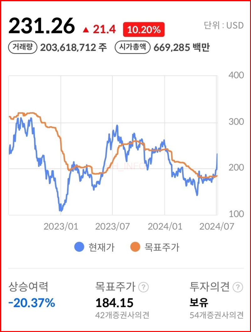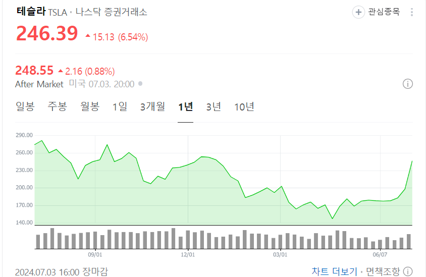 웨드부시 증권의 댄 아이브스는 테슬라 목표 주가를 275달러로 설정했어요. 테슬라가 더 이상 전기차 회사가 아닌 인공지능과 로봇 공학 회사에 더 가깝다고 설명했죠. 7월 23일에 2분기 실적 발표가 있고, 8월 8일에는 로보택시(무인택시) 공개가 있습니다. 7월 23일에 실적이 예상보다 잘 나오고, 가격 인하로 인한 영업 이익률 하락폭이 시장의 예상보다 덜 하다면 주가는 또 급등할 가능성이 있어요. 로보택시 또한 시장의 기대치를 넘어선다면 올해 안에 전고점을 돌파할 수 있을 거예요.