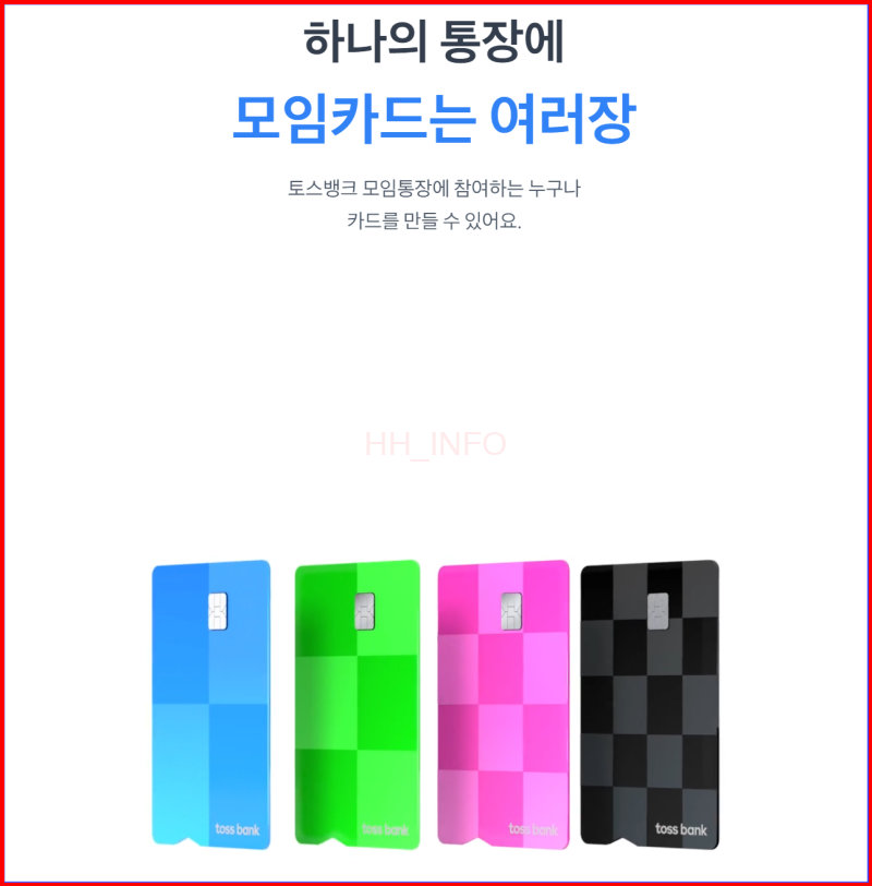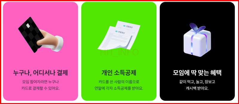 - 공동 자금 관리: 모임원들이 공동 자금을 투명하게 관리할 수 있어요. 모임카드는 여러 장 발급받을 수 있고, 모임원 누구나 카드를 만들 수 있답니다.
