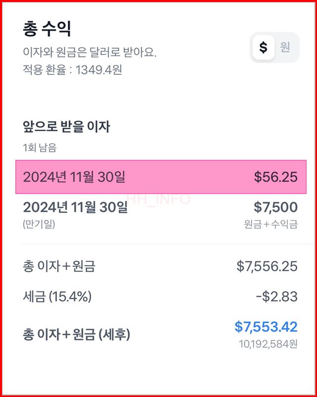 - 수익률 계산: 이자는 5.01% 기준으로 1개월 투자 시 약 56.25달러의 수익을 예상했습니다.