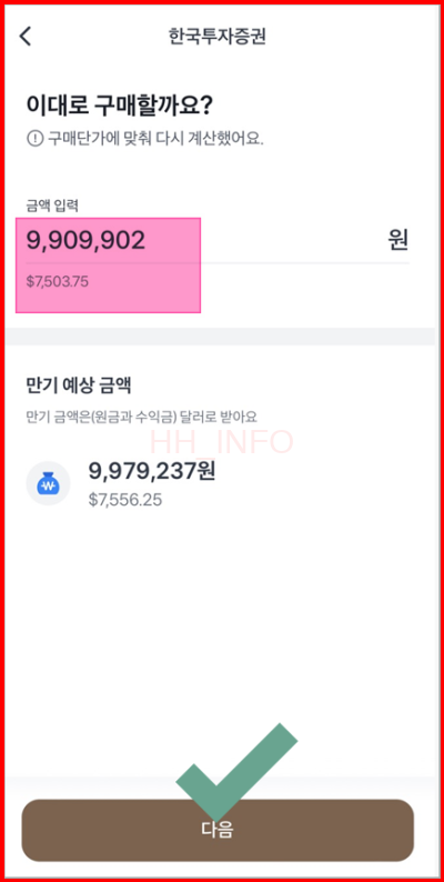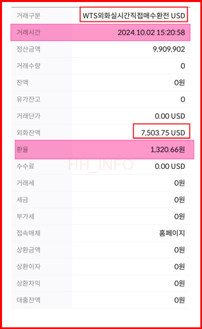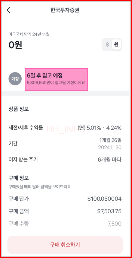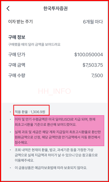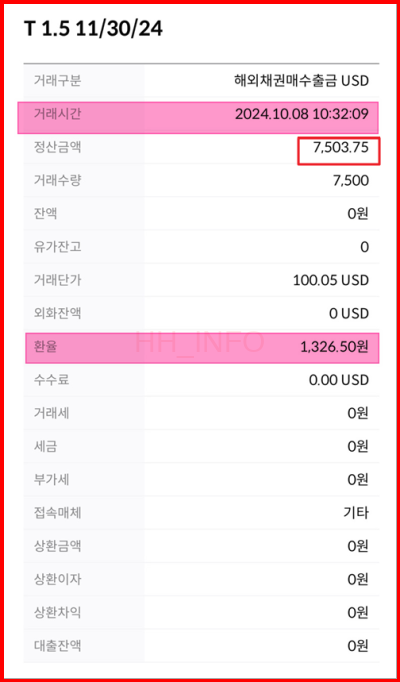 - 환율 적용 시점: 구매 당시의 환율이 기준이 됩니다. 저는 환전할 때 환율이 1,320.66원이었고, 채권 매수 금액은 7,503.75달러였습니다.