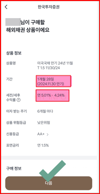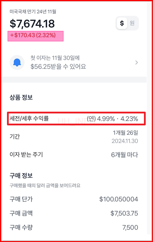 미국 국채 투자를 할 때 수익 계산은 중요한 요소입니다. 제가 투자한 미국 국채는 세전 수익률이 5.01%였으며, 7,503.75달러를 기준으로 계산되었습니다.
