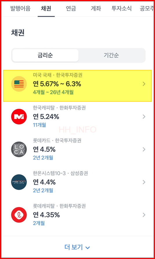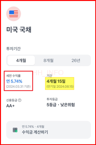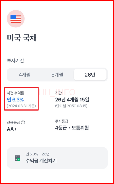 미국 국채는 다양한 기간으로 투자할 수 있으며, 각 기간에 따라 다른 수익률을 제공합니다. 예를 들어, 30년물(26년)의 경우 연 6.3%의 수익률을 제공하고 있습니다. 하지만 더 짧은 기간인 4개월의 경우에도 연 5.74%의 높은 수익률을 보장합니다.