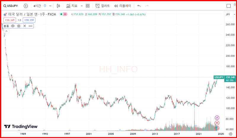 엔화를 평가할 때 중요한 비교 대상 중 하나가 달러입니다. 주간 기준으로 약 34년 동안의 달러/엔 환율 그래프를 살펴보면, 34년간 엔화 최저치였던 달러당 160엔대까지 하락한 것을 확인할 수 있습니다. 이는 엔화가 얼마나 저평가되어 있는지를 보여주는 지표 중 하나입니다.