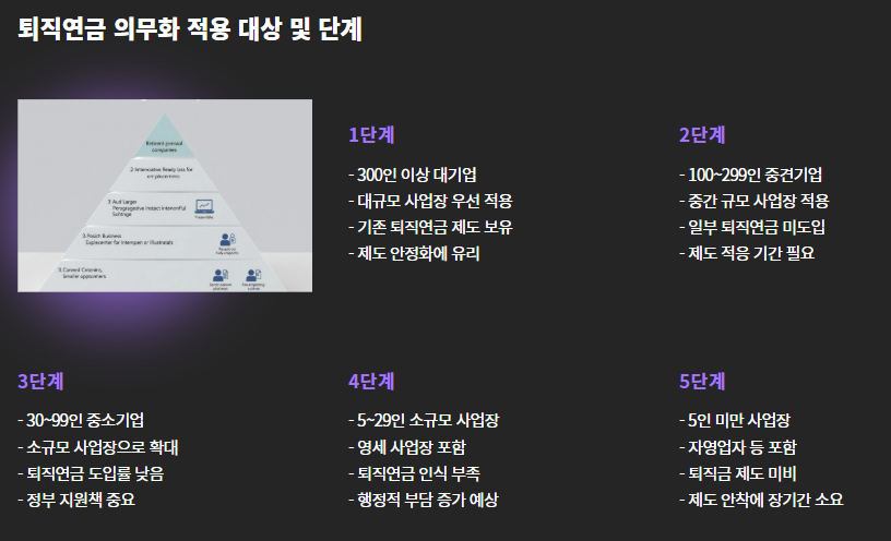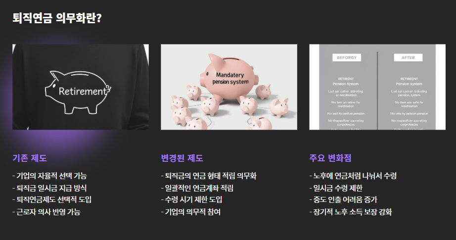 기존에는 기업이 자율적으로 퇴직연금 제도를 도입하거나, 퇴직금 일시금 지급 방식을 선택할 수 있었습니다.