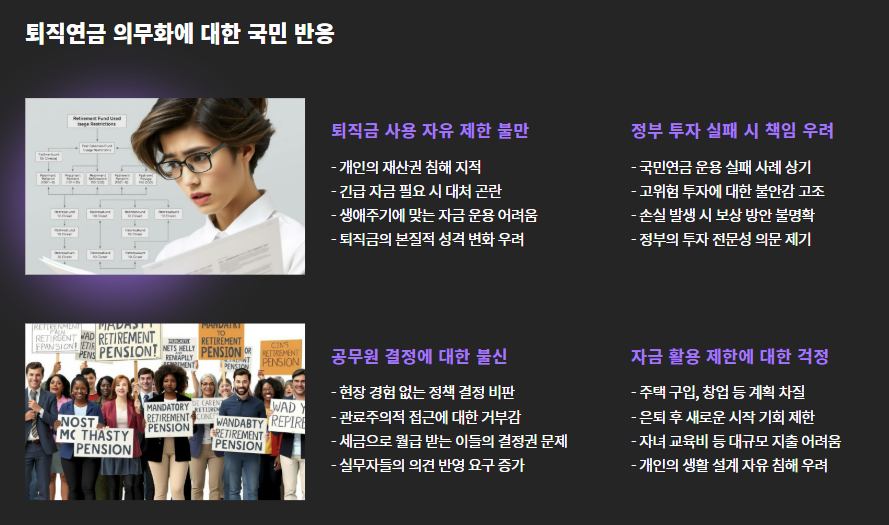최근 정부가 퇴직연금제도의 전면 의무화 방침을 발표하면서 많은 직장인과 자영업자들이 혼란과 분노를 표하고 있습니다.