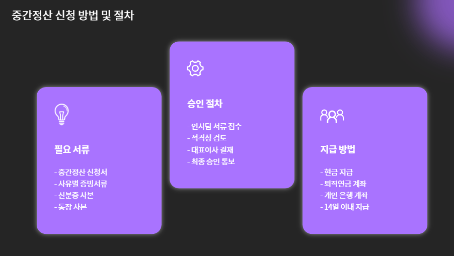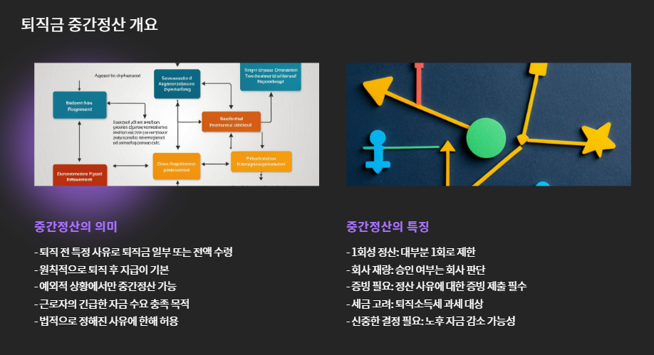 퇴직일로부터 14일 이내 지급이 원칙입니다. - 중간정산은 특정한 사유가 있을 때만 가능하며,