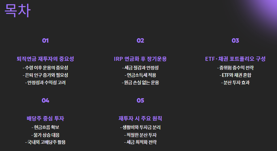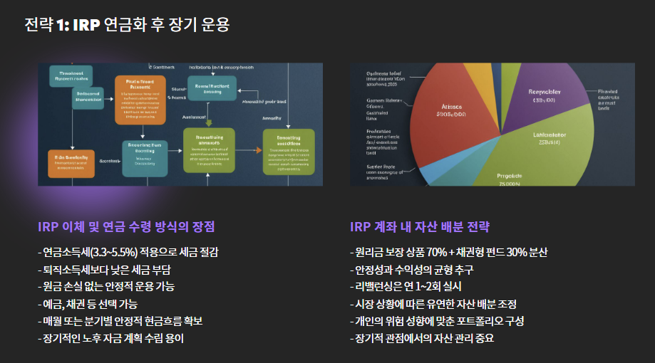 | 1. IRP 연금화 후 장기운용 | 세금 절감 + 안정성 | 절세 우선, 장기 안정성 추구 |
